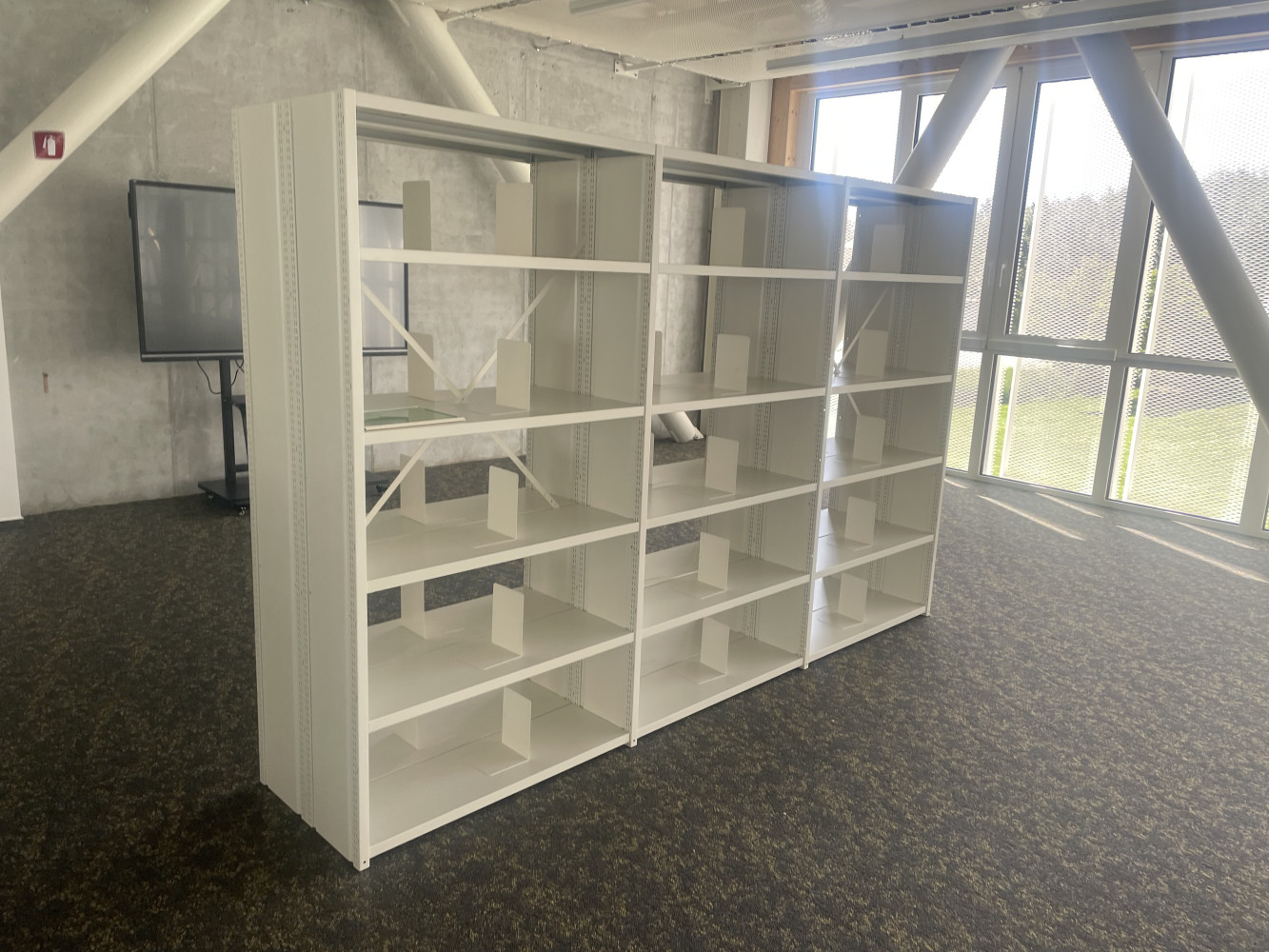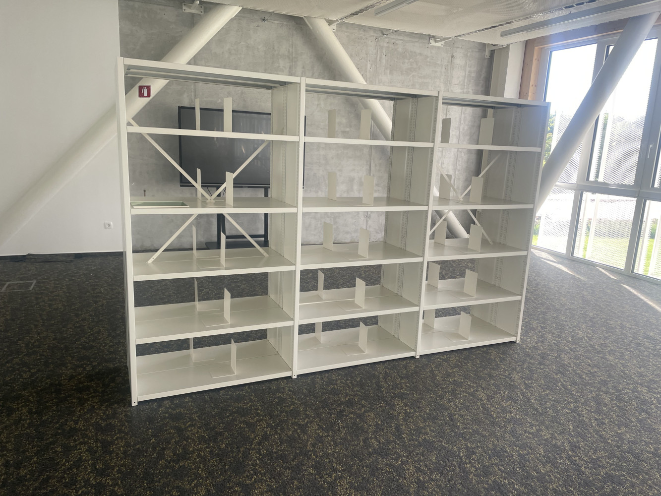 Projekt: Montaža statičnega knjižnega regala FOREG v beli barvi RAL 9010.